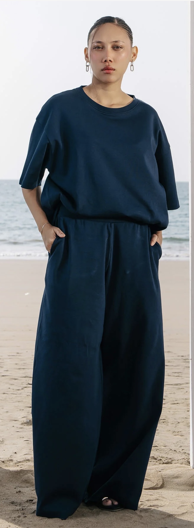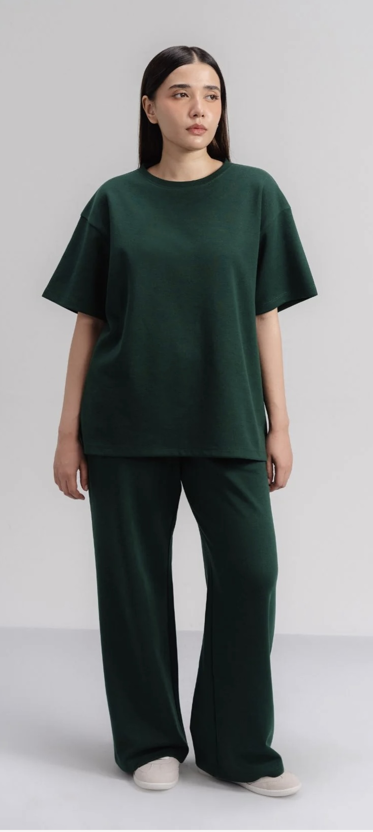 Oversized Double Knit T-Shirt & Move Wide Trousers: Crafted from premium double-knit fabric, this set pairs a breathable, wrinkle-resistant oversized tee with wide-leg trousers. The result? A relaxed yet polished silhouette that’s effortlessly chic, whether styled for casual outings or smart essentials.