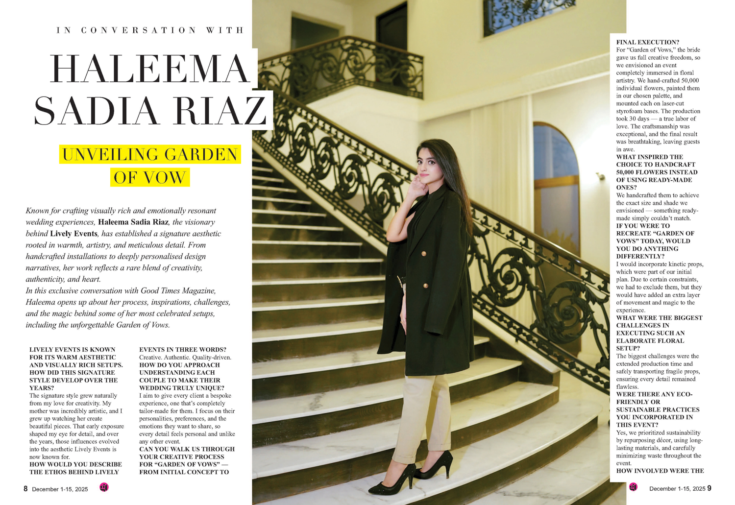 In this exclusive conversation with Good Times Magazine, Haleema opens up about her process, inspirations, challenges, and the magic behind some of her most celebrated setups, including the unforgettable Garden of Vows.