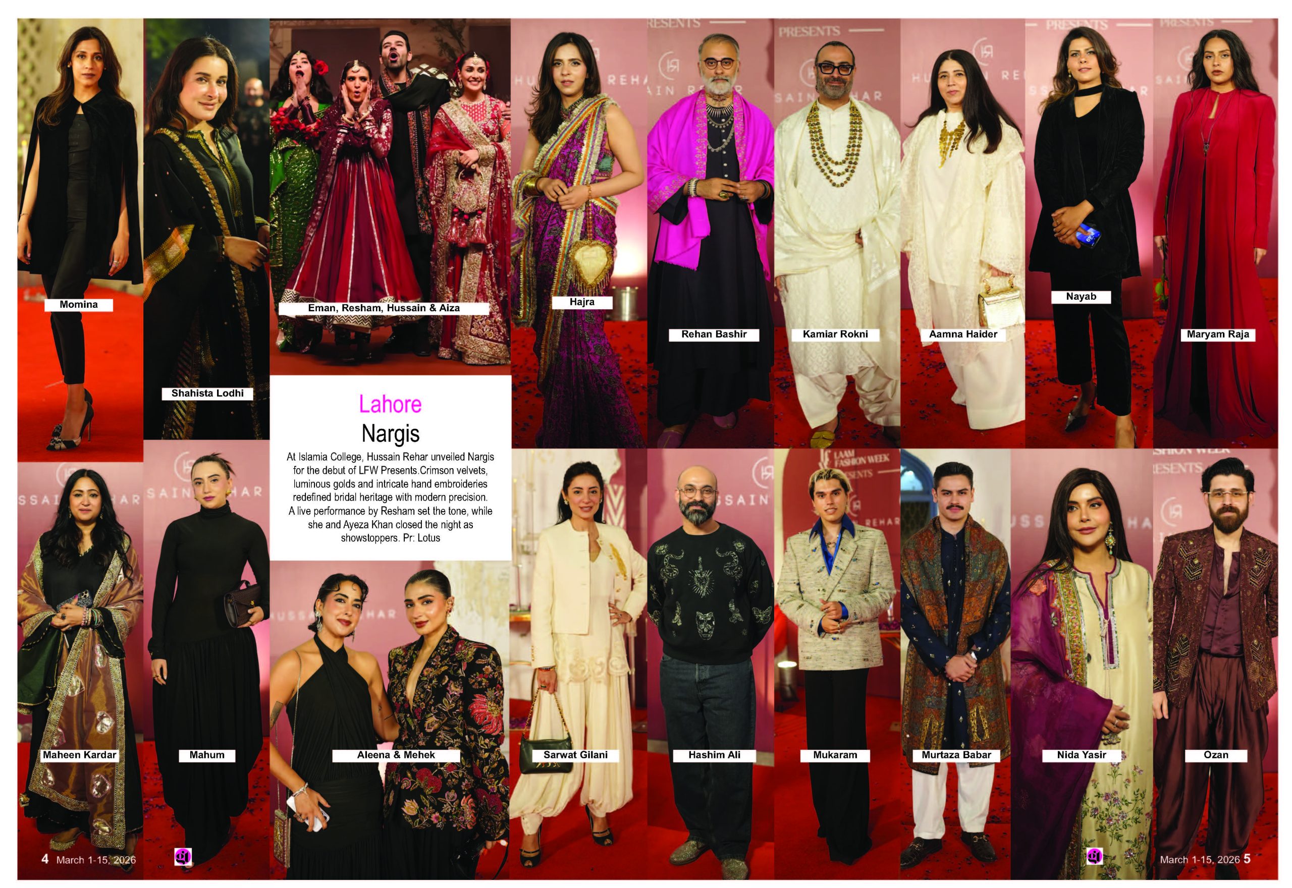 At Islamia College, Hussain Rehar unveiled Nargis for the debut of LFW Presents. Crimson velvets, luminous golds and intricate hand embroideries redefined bridal heritage with modern precision.