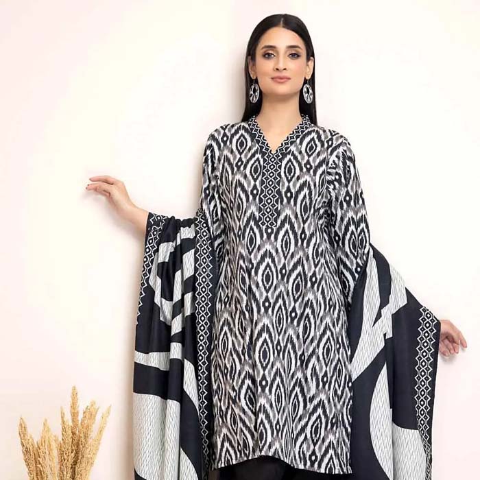 There’s something special about the black-and-white prints that women love and this 3-piece set is an excellent example. It has a printed khaddar dupatta and a printed shirt with dyed trousers. No matter how you style it, this outfit will always get you great compliments.
