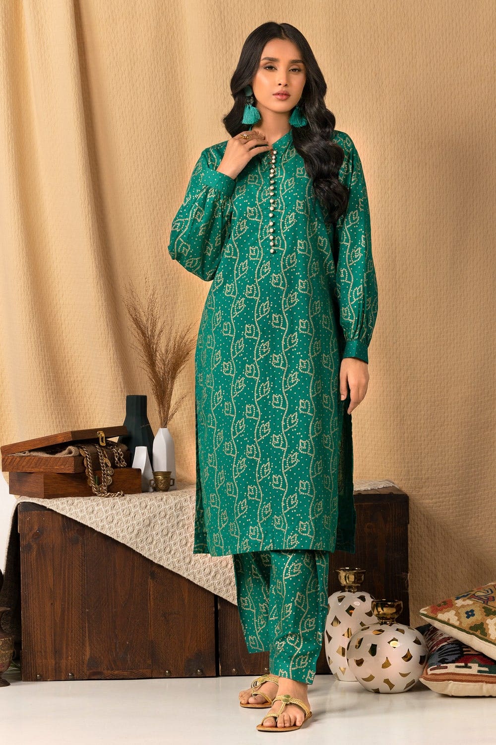This cambric dress is for those who want to look stylish on Eid. This eye catching ferozi dress is block printed in shades of gold and white. The block printed pattern is small and appeals to the eyes. The neckline, sleeves and daman have a different border to complete the look. This dress will be a great addition to your wardrobe. This stitched suit is available in all sizes. You will be the center of attraction where ever you go wearing this unique dress.