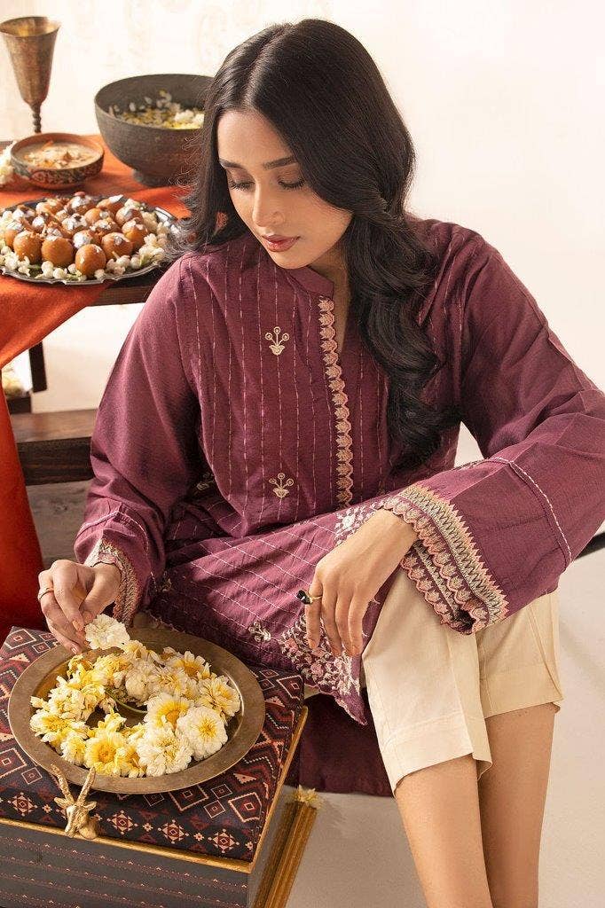 This purple zartaar jacquard shirt is an excellent choice to be worn when you are heading out to meet your loved ones this Eid. The golden lines of jacquard leave an amazing effect on the purple tone of the shirt mesmerizing the spectators. There is lace on the neckline and sleeves to complete the look. This is what we call simple, yet elegant!